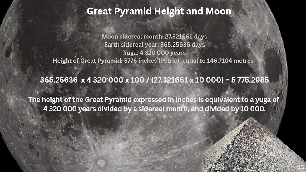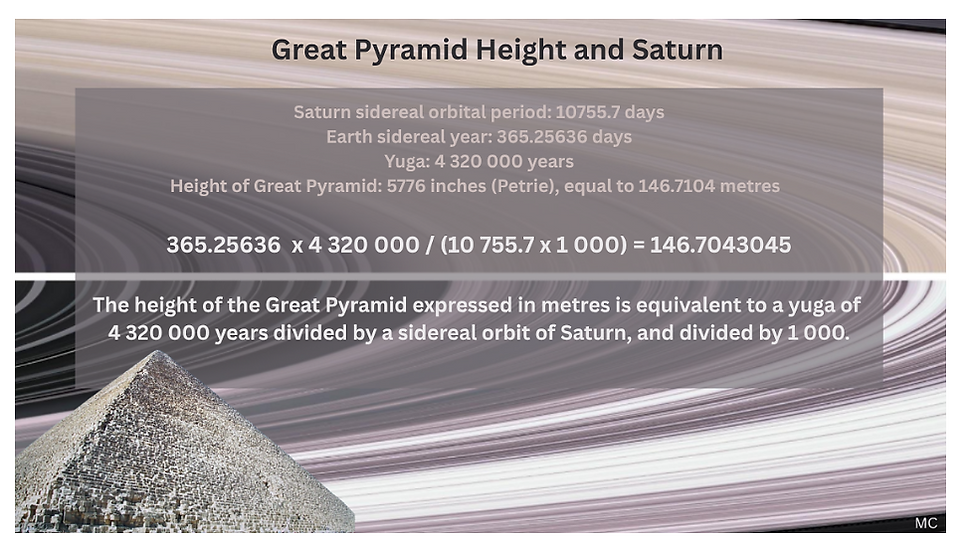 So seeing the height of the Great Pyramid as an expression of Saturn’s sidereal period therefore also brings the sun and moon into play. To go back to inches, the height can be interpreted as the number of sidereal periods of Saturn in a yuga of 4 320 000 sidereal years of 365.25636 days, divided by the number of sidereal months in a Metonic cycle (254).